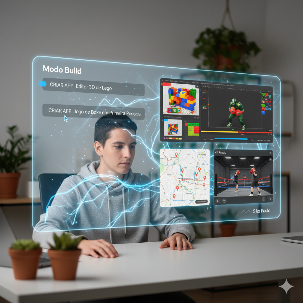 O modo Build é onde o Gemini 3.0 realmente brilha para criadores. Com ele, é possível gerar: