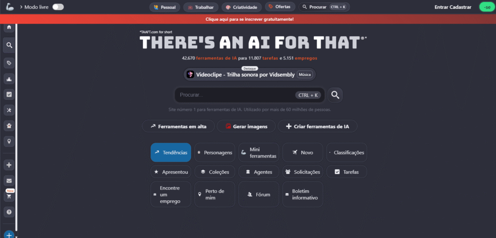 Ei, você que passa horas caçando a ferramenta de IA perfeita para editar um vídeo, gerar ideias ou automatizar tarefas chatas: já se sentiu perdido no mar de opções novas todo dia? Pois é, em 2025, com mais de 42 mil ferramentas de IA disponíveis, fica fácil se afogar em hype sem resultados reais. Mas calma, tem salvação! O “There’s An AI For That” (ou TAAFT, como chamamos de carinho) é o mapa do tesouro que te leva direto ao que funciona. Essa plataforma é um hub gigante onde você descobre, avalia e até monetiza IAs para tudo – de design a marketing. Hoje, vamos explorar como ela transforma confusão em produtividade turbo. Se você é criador, empreendedor ou só curioso, isso vai te poupar semanas de pesquisa. E no final? Te mostro um curso que te ensina a integrar essas gems na sua rotina. Bora desvendar?